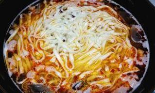 6. 享用美味:倒入适量的热汤,搅拌均匀,美味的爆料火锅面就大功告成了!